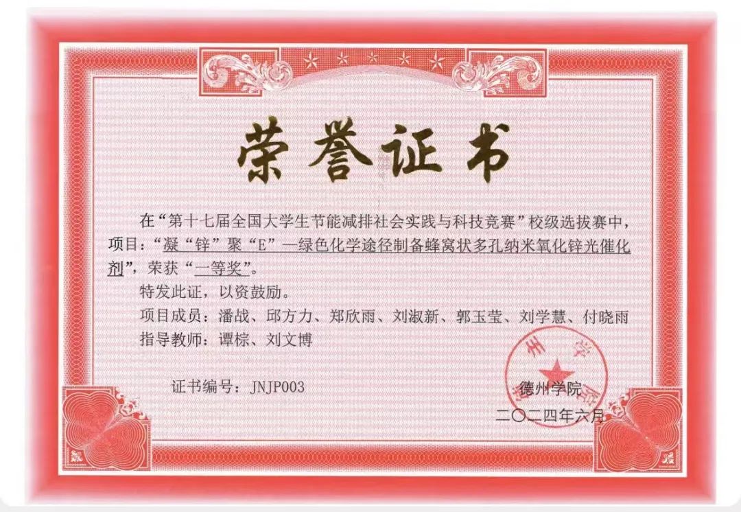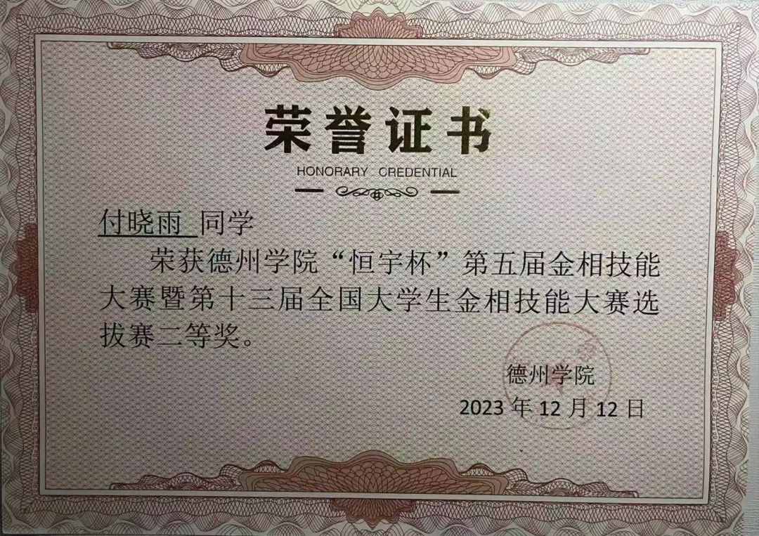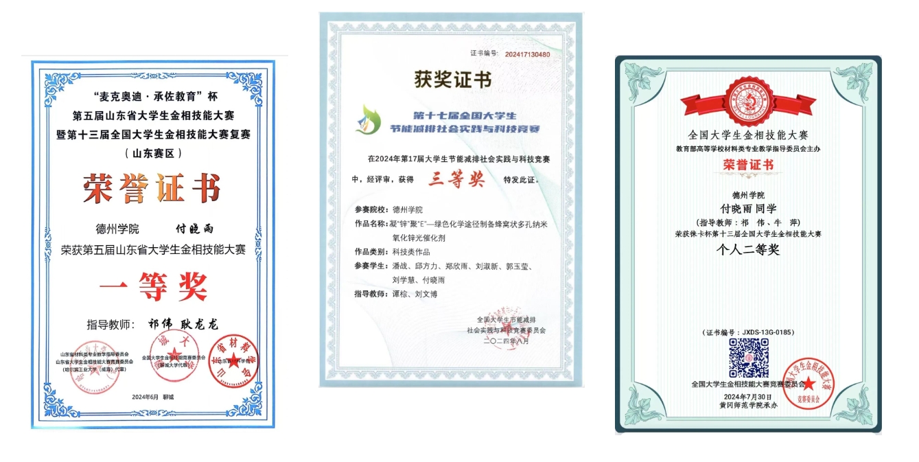 在2023-2024学年里,她向往科研,不断求索,奋力拼搏,坚持不懈,获得了全国大学生金相技能大赛全国个人二等奖、全国大学生节能减排社会实践与科技竞赛国赛三等奖、全国大学生金相技能大赛省赛个人一等奖(并以个人总分全省第一名的成绩获得了麦克奥迪特别奖)、全国大学生金相技能大赛省赛团体三等奖、“挑战杯”大学生创业计划竞赛校赛二等奖等5项奖项,她为beat365争得了荣誉,让全省高校见证了德院学子的综合实力。