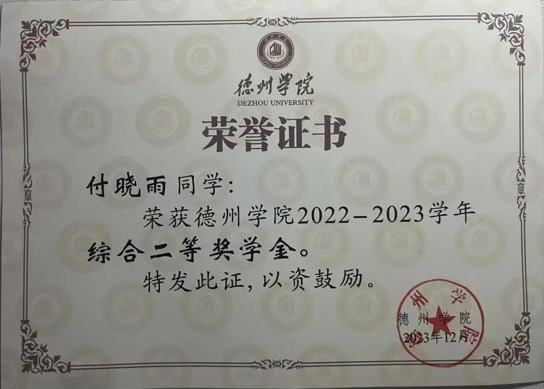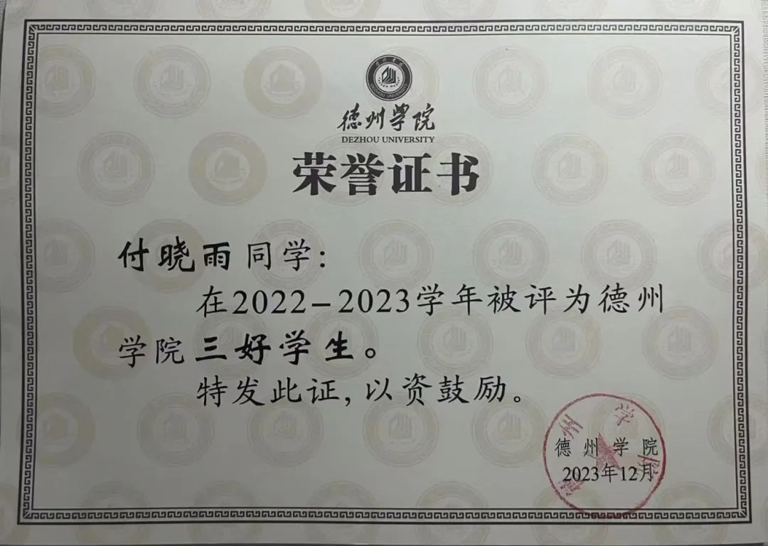 在2023-2024学年里,她担任学生教育部副部长一职,以思想政治教育、安全教育、毕业生教育为主,带领部门干事举办活动、撰写新闻稿、撰写活动总结,荣获2023学年工作考核全校第一名的成绩。此外,她积极参加三下乡活动、青鸟计划等活动,相关事迹被感知山东等多家媒体报道,累计志愿时长达60学时,获得三下乡优秀视频团队等荣誉称号。