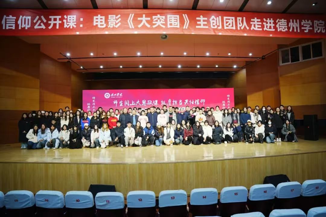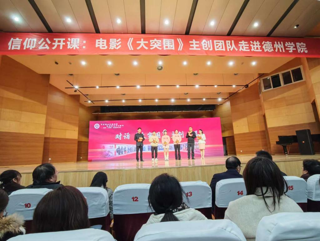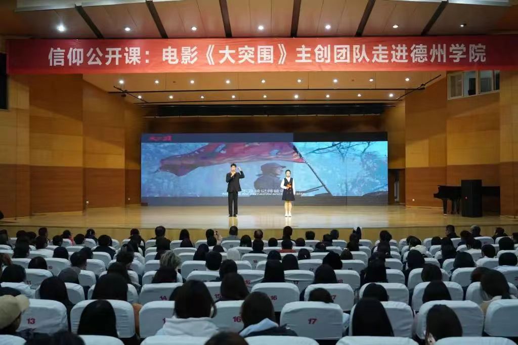 为激发现代青年大学生的爱国情怀,铭记历史,珍惜当下的和平生活,传承弘扬红色沂蒙精神。12月9日beat365官方网站于南校音乐厅组织开展了信仰公开课:“电影《大突围》走进德院”活动。电影《大突围》出品人、总制片人陶姝君,导演杨真、演员廉知颖、副导演阿坤出席,beat365官方网站“薪火沂蒙志愿宣讲团”积极参入到活动当中,深入学习红色沂蒙精神的内涵。