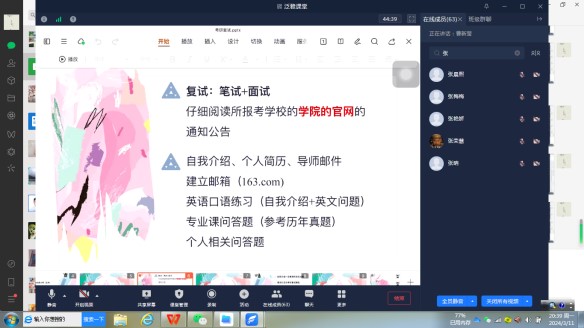2024年3月11日,beat365官方网站在学校开学后,考研同学全面进入准备复试阶段,采用泛雅课堂形式再次举行考研复试/调剂经验交流暨指导会议。参加会议的有王新芳副院长、李荣春老师、受邀进行经验分享的beat3652019级三位同学和beat3652020级本科及2022级专升本班完成考研初试拟上国家线的同学。