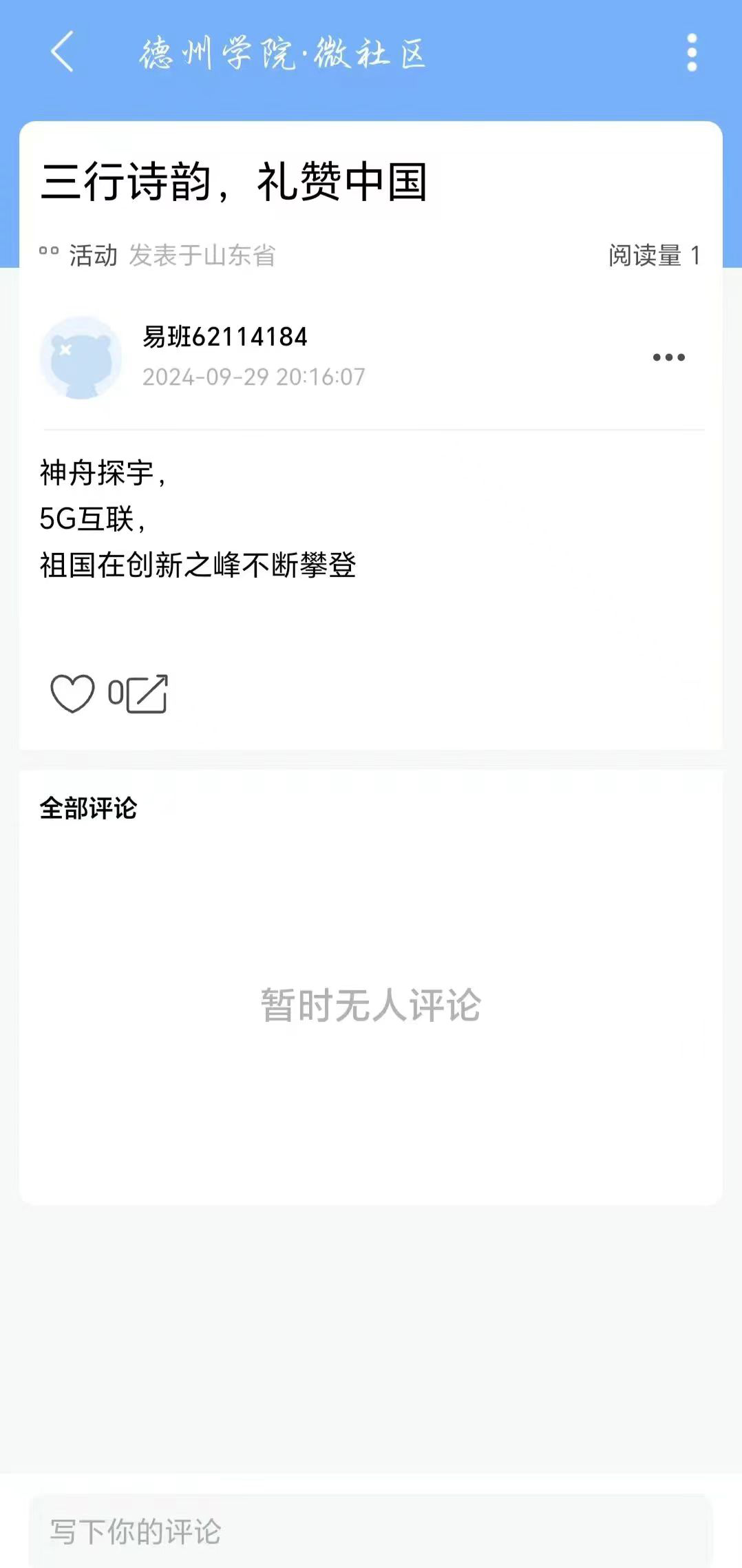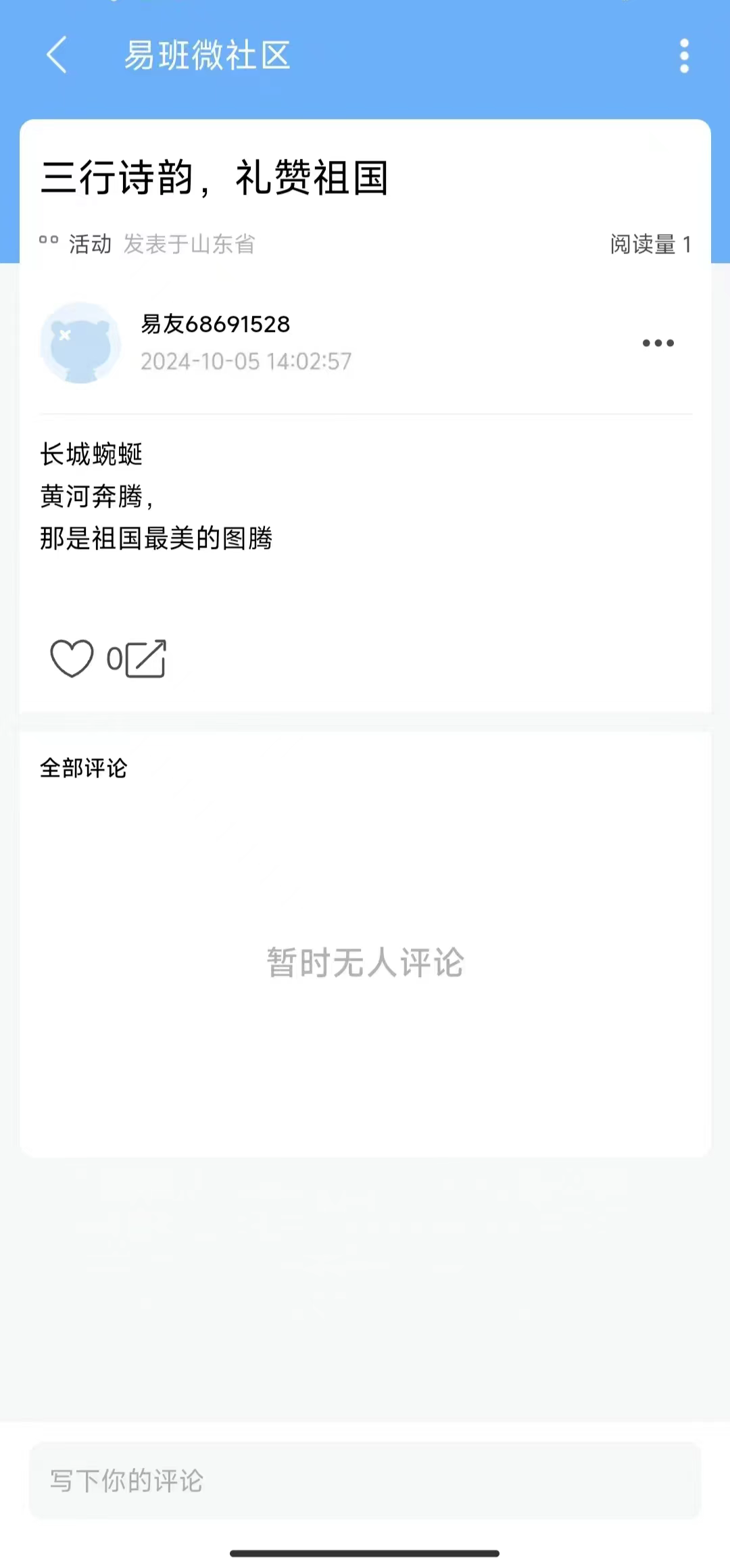 在国庆佳节来临之际,为激发同学们的爱国情怀,表达对祖国的热爱与赞美,10月1日到10月5日beat365官方网站举办“三行诗韵,礼赞祖国”线上易班活动。