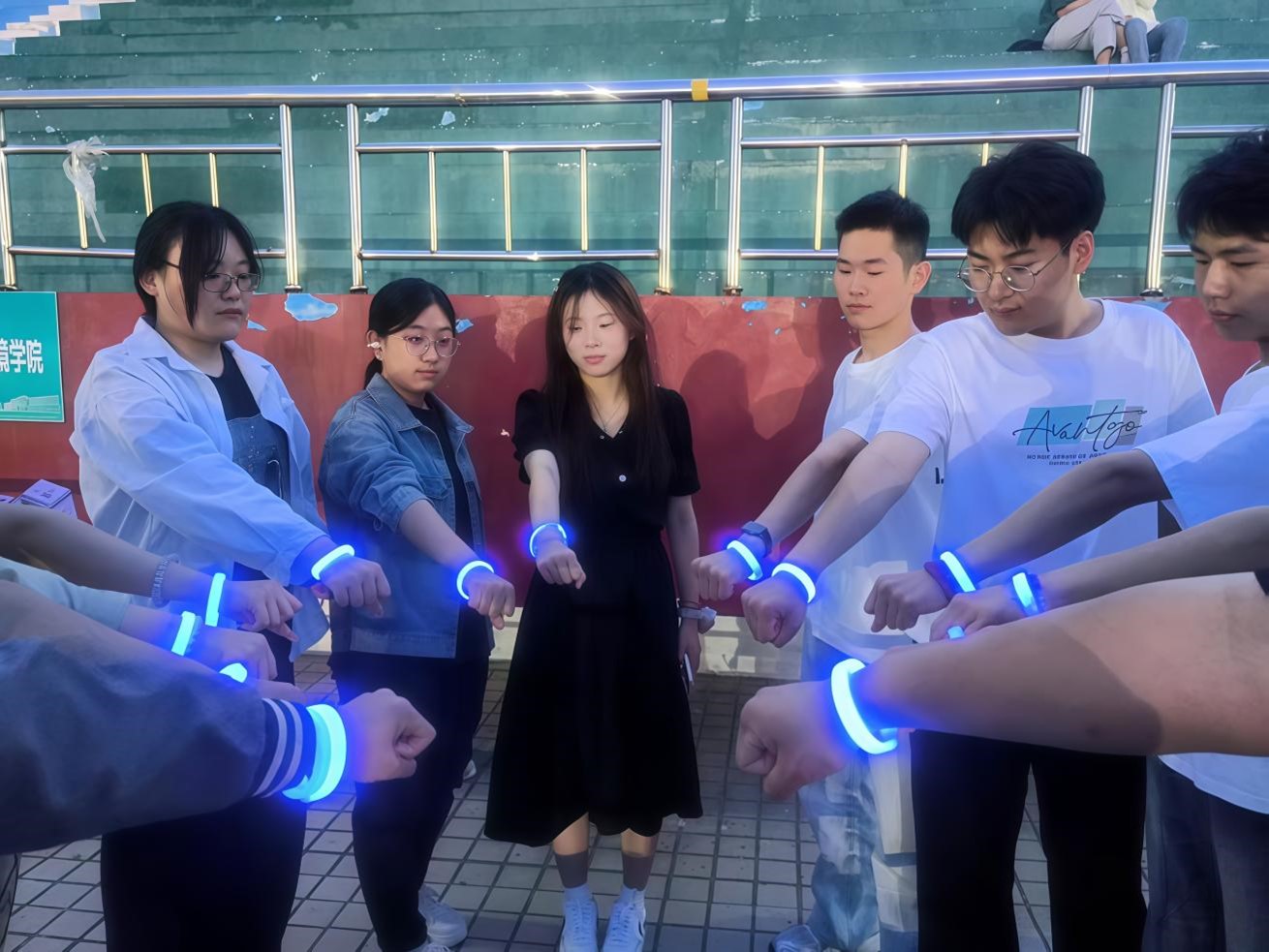 在负责人详尽讲解本次活动规则后,活动正式拉开序幕,工作人员将定制荧光手环逐一派发到学生手中,蓝色荧光带在青年腕间蓄势待发。起跑哨声划破暮色,数道流光霎时迸发。蜿蜒赛道上,跃动的光点忽而聚作璀璨星云,忽而散作彗星轨迹;你追我赶中传递着鼓励的呼声,喘息与欢笑谱写成青春的乐章。冲刺时刻,荧光阵列如银河倾泻涌向终点。活动结束后,负责人公布名次,为参与者颁发奖品。