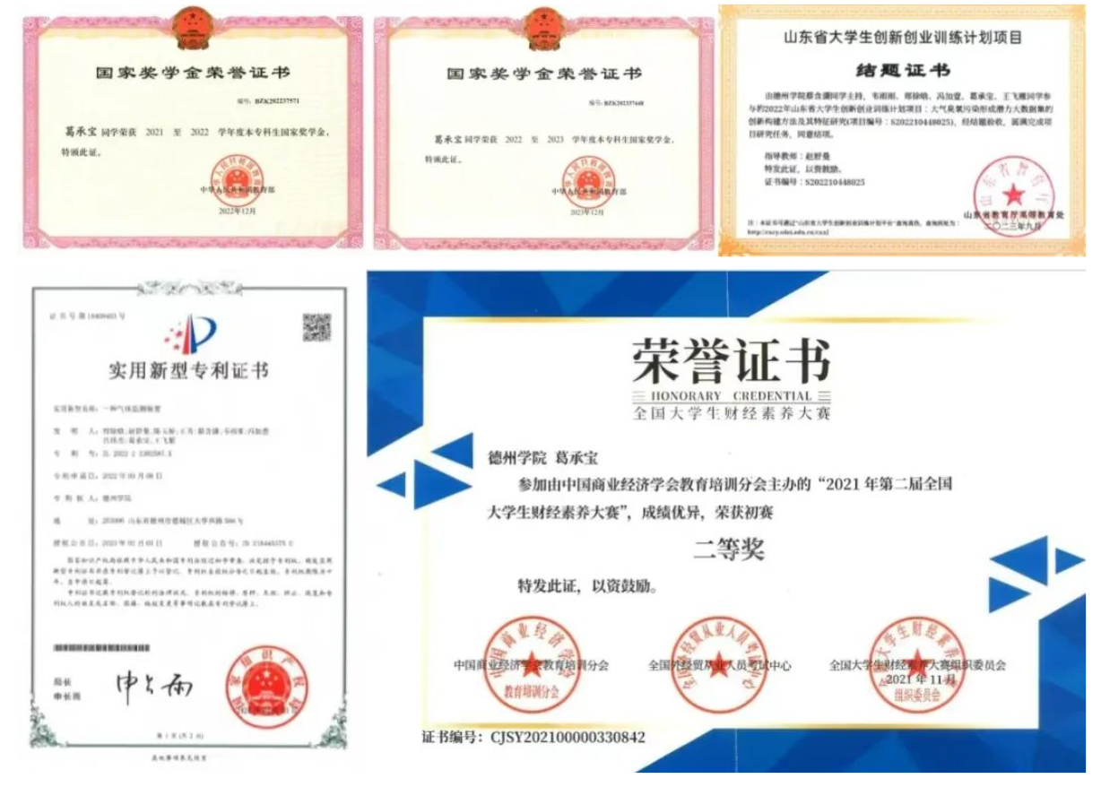 连续两学年学业成绩与综测成绩均位列专业第一名。曾获“2021-2022”学年国家奖学金、“2022-2023”学年国家奖学金、“2023-2024”学年国家奖学金、山东省优秀学生干部、山东省优秀学生、beat365官方网站优秀大学生奖学金、综合一等奖学金、综合二等奖学金、十佳大学生、十佳学生干部、优秀学生干部、优秀共青团干部、三好学生等荣誉。