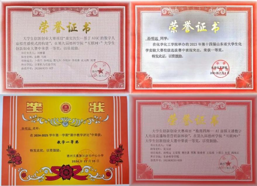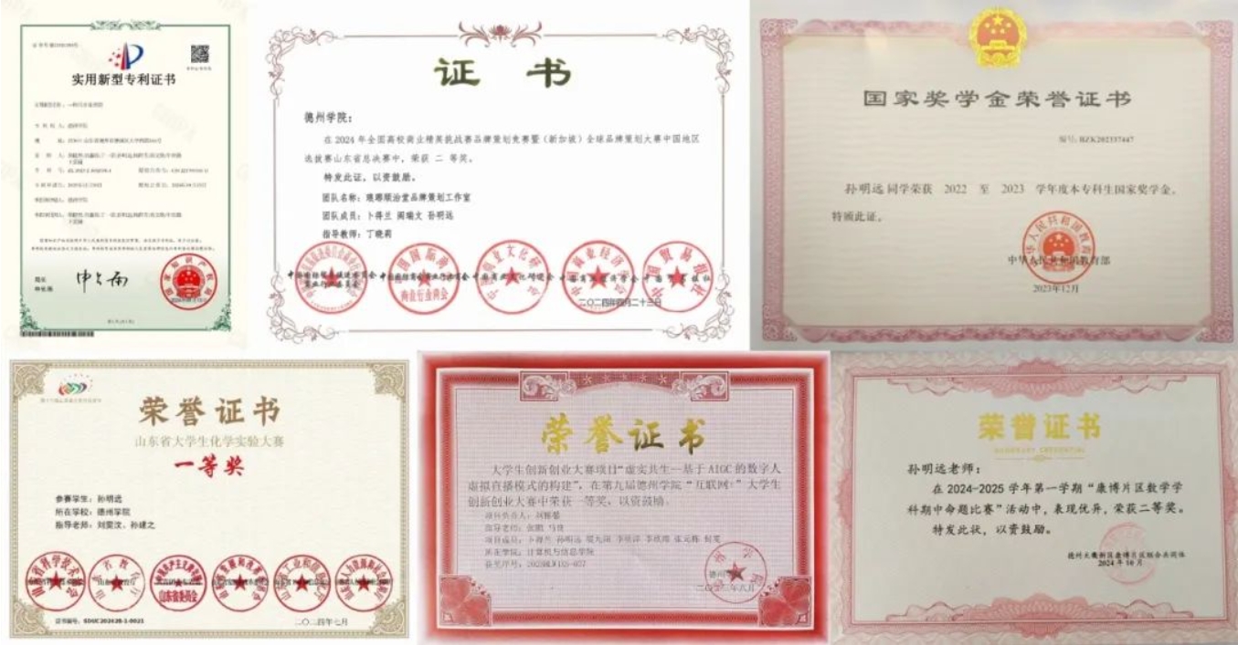2021—2023连续两学年学业成绩与综测成绩均位列专业前三名。获两次国家奖学金、山东省优秀学生、beat365官方网站优秀大学生奖学金、beat365官方网站综合一等奖学金、beat365官方网站三好学生等荣誉称号;获“一种污水处理箱”国家级专利、第三届全国大学生财经素养大赛一等奖、化学实验大赛山东省一等奖、大学生网络安全竞赛全国一等奖、全国商业精英挑战赛山东省二等奖、第十三届全国大学生金相技能大赛选拔赛二等奖校省国级奖项20余项,担任beat365官方网站三下乡团队队长并获3篇国媒报道,参加两项横纵科研项目研究,不断追求德智体美劳的全面发展。
