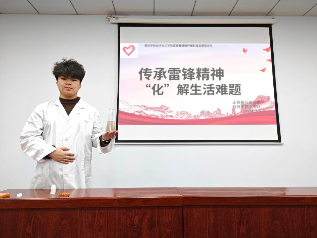 活动伊始,志愿者们围绕雷锋同志的奉献精神与助人为乐事迹展开讲述,带领参与者深刻感悟雷锋精神的内涵。在互动环节,志愿者们借助高锰酸钾与维生素C的氧化还原反应,生动地诠释了奉献精神。当紫红色的高锰酸钾溶液接触到维生素C后,溶液逐渐褪色,直至变为无色透明。志愿者们巧妙地将化学反应中的电子转移与雷锋精神的传承相联系,向大家解释道:“电子的转移就如同爱心的传递,雷锋精神恰似那活跃的电子,在人与人之间不断流动,照亮他人,温暖社会。”随后,志愿者们结合日常生活场景,科普氧化还原知识,分享了如用维生素C去除茶渍、清洗衣物等实用技巧。