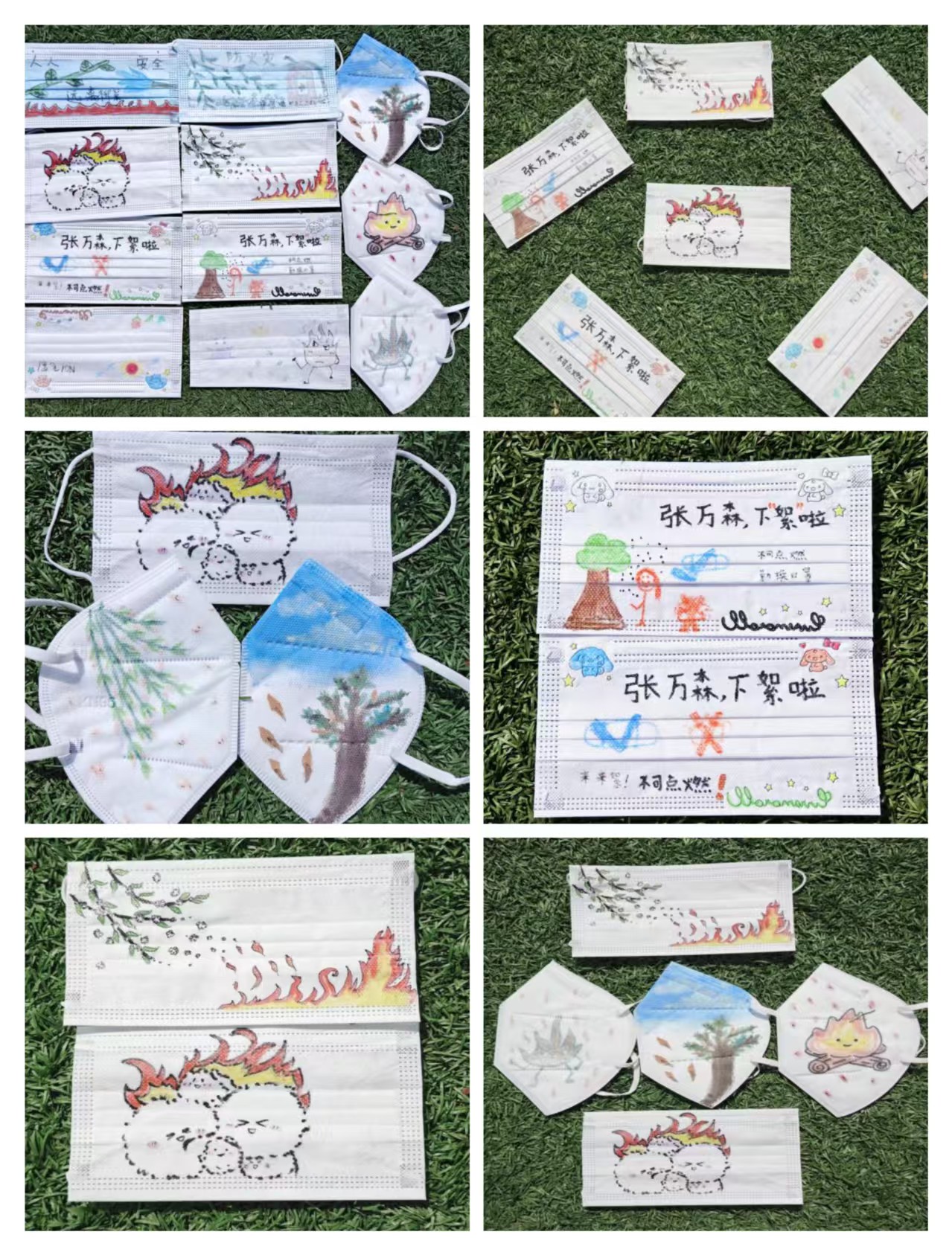 活动过程中,同学们热情高涨,创意频出。在创作的口罩作品中,有的以细腻笔触绘出垂柳依依,柳枝间点缀小心形图案,既展现春日美景,又寓意着对安全的珍视,提醒大家在杨柳絮纷飞季做好防护;有的则呈现出苍劲松枝的场景,几片柳叶飘落,传达出面对柳絮火灾隐患要时刻保持警觉之意;还有的则用绿叶、竹子等元素,配上“远离柳絮”“不可点燃”等字样,突出防柳絮、易着火主题。同学们利用色彩搭配和巧妙构图,将实用口罩转变为兼具防护功能与艺术价值的物品。