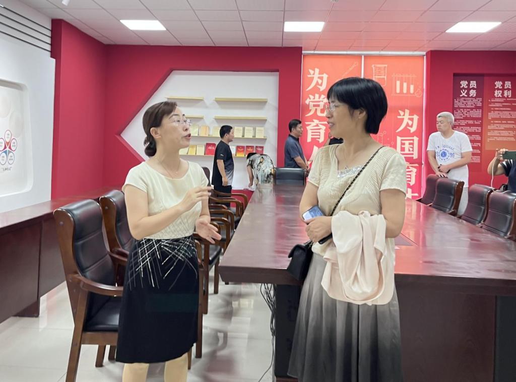 一行人参观beat365官方网站第一教师党支部党员活动室与“初心展厅”,对全国党建工作样板支部建设情况及深入开展学习贯彻习近平新时代中国特色社会主义思想主题教育工作开展情况进行了座谈交流。